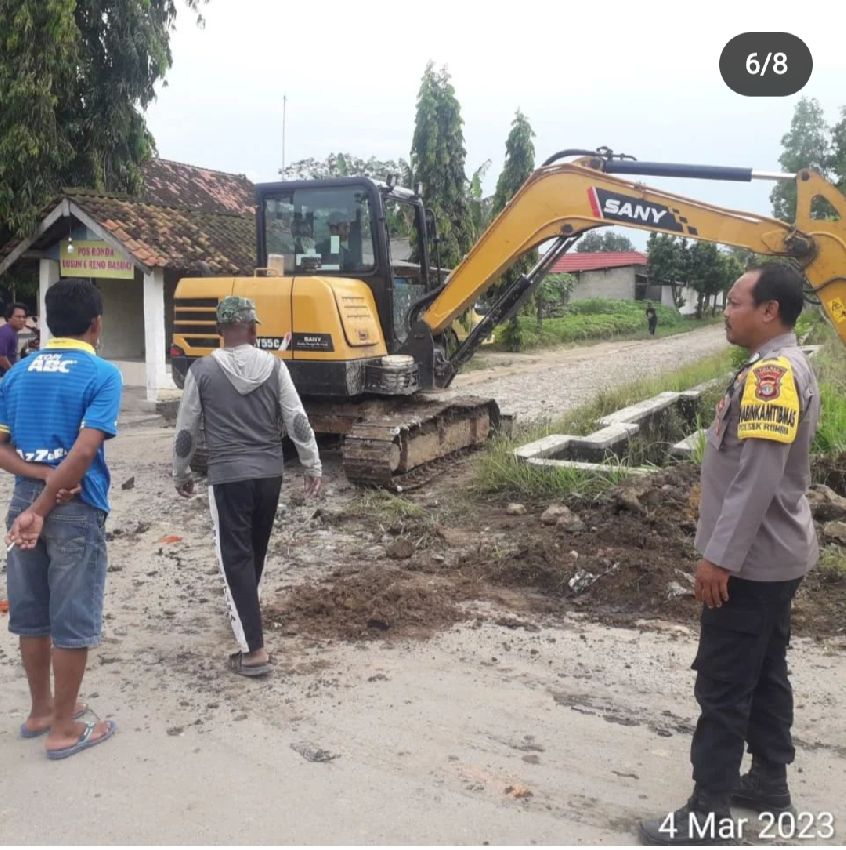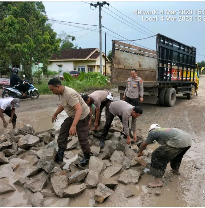 LAMPUNG TENGAH : Polsek Rumbia Polres Lampung Tengah dan Koramil, Forkopincam setempat Gerak Cepat timbun jalan berlubang yang viral dikeluhkan masyarakat, Sabtu (04/03/2023)