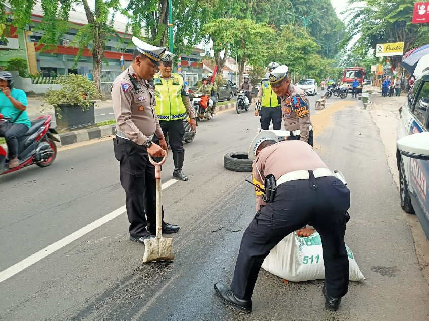 “Setelah itu kendaraannya pergi, rupanya kendaraan itu mengeluarkan oli. Jadi olinya itu tercecer sepanjang kurang lebih 100 meteran, maka kami dengan cepat langsung mengambil langkah untuk melakukan penimbunan menggunakan pasir,” jelas Kasat.